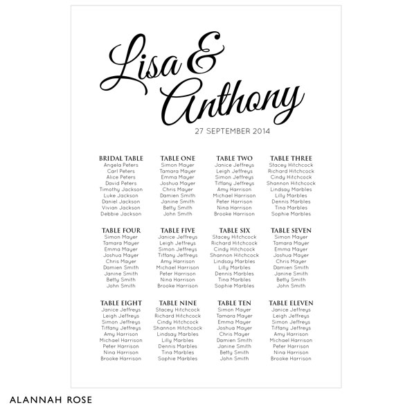 This guest seating chart is the perfect way to help your guests find their table. Choose from our Glossy Poster Stock for insertion into a frame of your choice or order our Self-adhesive Stock, which you can adhere to a solid backing board, such foam board or corflute.