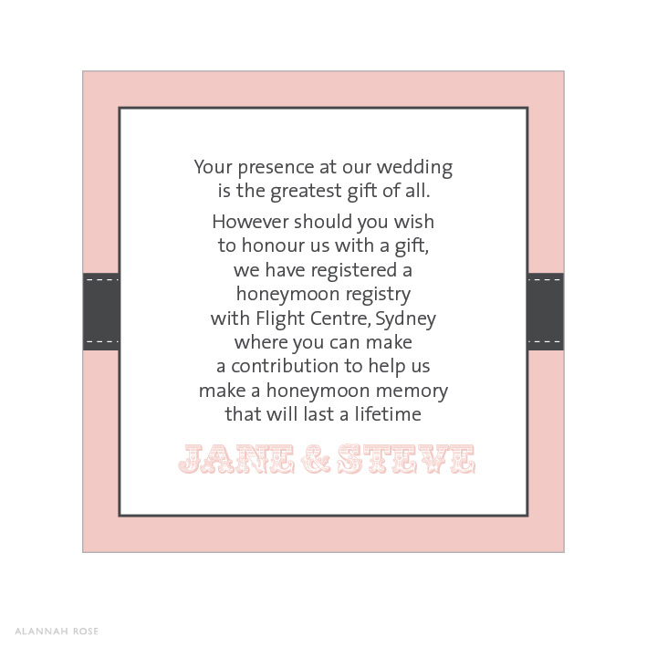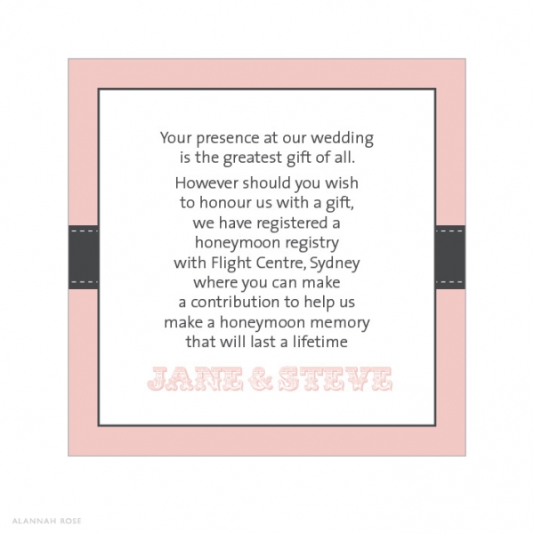 These cards are ideal for those wishing to advise guests of gift or wishing well ideas. They are printed to one side only on Satin Deluxe card stock, and are perfect for slipping into the envelope with the invitation. Shimmer or Textured card stock is available at an additional charge. For those with extra text, we can print to the reverse for an additional charge. Flat size 68 x 68mm