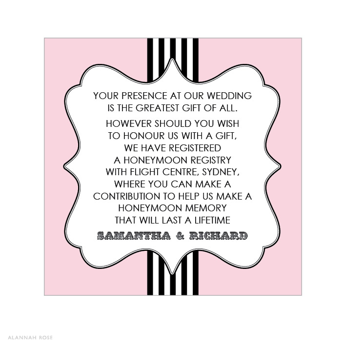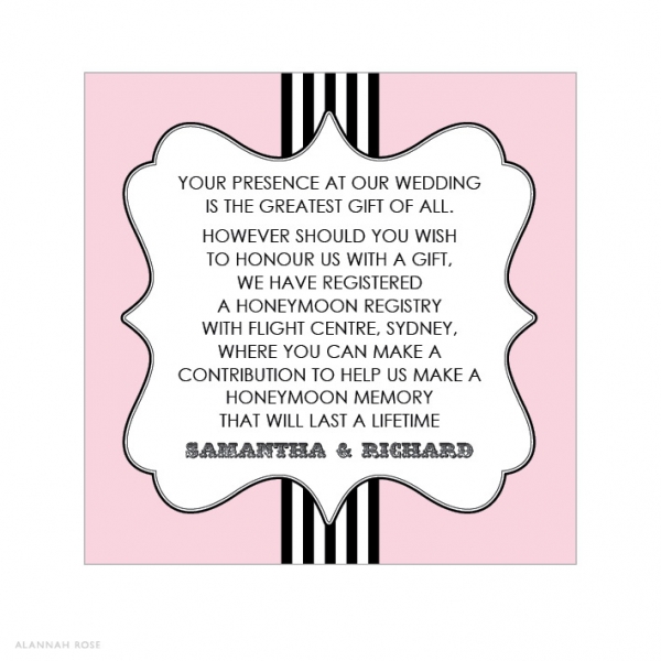These cards are ideal for those wishing to advise guests of gift or wishing well ideas. They are printed to one side only on Satin Deluxe card stock, and are perfect for slipping into the envelope with the invitation. Shimmer or Textured card stock is available at an additional charge. For those with extra text, we can print to the reverse for an additional charge. Flat size 68 x 68mm