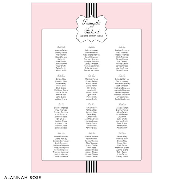 This guest seating chart is the perfect way to help your guests find their table. Choose from our Glossy Poster Stock for insertion into a frame of your choice or order our Self-adhesive Stock, which you can adhere to a solid backing board, such foam board or corflute.