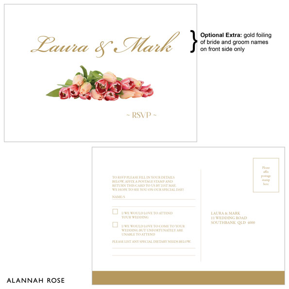 These beautiful RSVP postcards are printed double-sided and are an easy and convenient way to have your guests RSVP. All they need to do is fill in their details, place a postage stamp on the back and post it – no envelopes required! Printed on high quality Satin Deluxe card stock. Shimmer or Textured card stock is available at an additional charge.