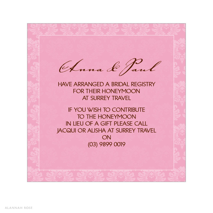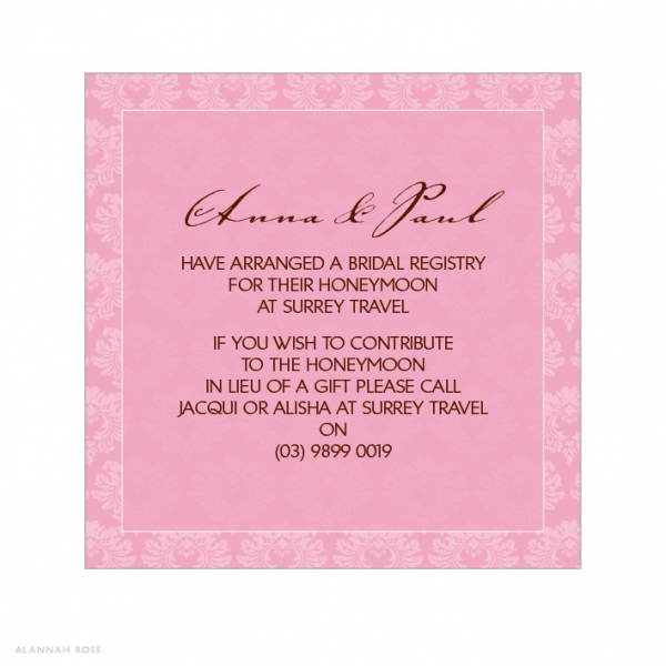 These cards are ideal for those wishing to advise guests of gift or wishing well ideas. They are printed to one side only on Satin Deluxe card stock, and are perfect for slipping into the envelope with the invitation. Shimmer or Textured card stock is available at an additional charge. For those with extra text, we can print to the reverse for an additional charge. Flat size 68 x 68mm