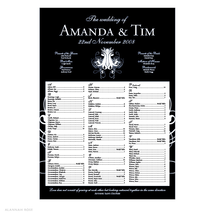 This guest seating chart is the perfect way to help your guests find their table. Choose from our Glossy Poster Stock for insertion into a frame of your choice or order our Self-adhesive Stock, which you can adhere to a solid backing board, such foam board or corflute.