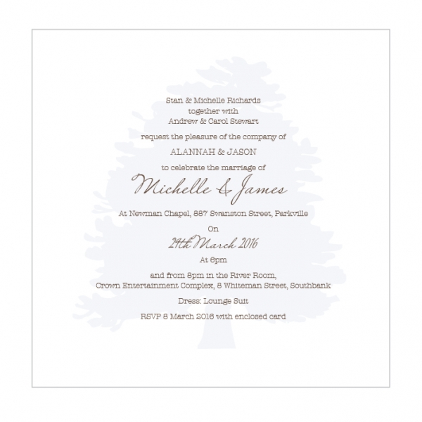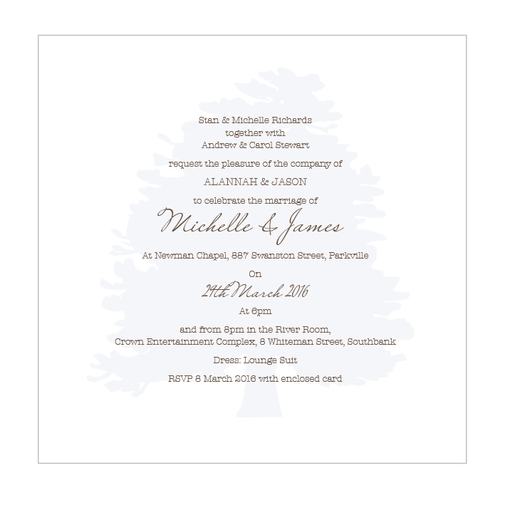 These single sided wedding invitations are sure to leave a lasting impression on your guests. Square card invitation printed to the front side only on a Satin Deluxe card stock. Shimmer or Textured card stock is available at an additional charge. Envelopes are included (smooth white envelopes are provided for Textured card stock). Guest names can be printed on invitations and/or envelopes, please select the personalisation option if you require this. Other colour options are available please see our colour chart for details. Flat size 140 x 140mm.